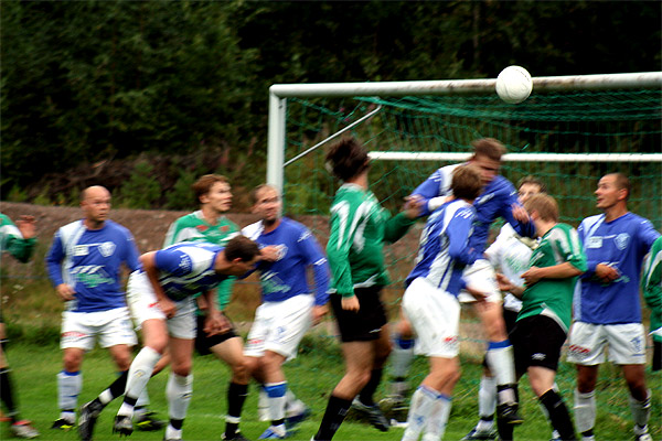 Frispark blir slått inn i feltet. Først blir ballen headet i stolpen før en Skjettenspiller får satt
