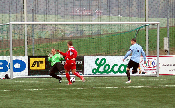 Etter en snau halvtime kom dagens første mål. Sørumsand kontrer og Marius Barikmo får ballen på midtbanen. Han drar med seg ballen med hånda, men en særdeles svak dommer i Tom Harald Pedersen fikk det ikke med seg. Barikmo stormet mot mål, dro av Lars Bjerkek og var sikker alene med Glenn Mærli. Den ene linjemannen innrømmet at han så Barikmo bruke hånda og sa det var hands, men han ville ikke vinke siden han stod for langt unna. Da kan det bli tungt å følge med på offside som kan være 50-60 meter unna.